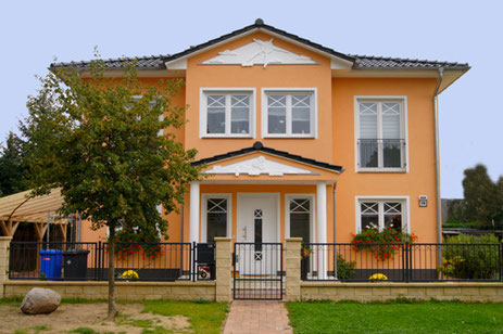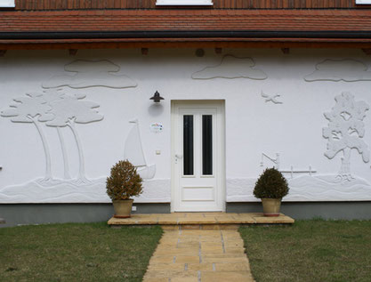 eine Fassadengestaltung von 2008 an einem Haus an der Havel bei Fürstenberg - hergestellt aus den Komponenten des Fassaden-Wärmedämm-Systems mit Styropor. Direkt an der fertig geputzten Fassade